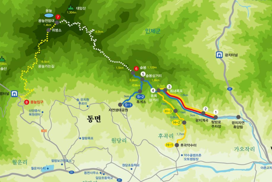 - 이동 경로: 서흥리 탐방안내소 → 큰 용늪 → 대암산 정상 → 탐방안내소